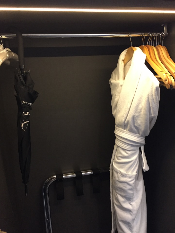 The closet contained an umbrella (this is London and it was raining), robes, slippers (yeah!) and enough space to unpack a large suitcase.