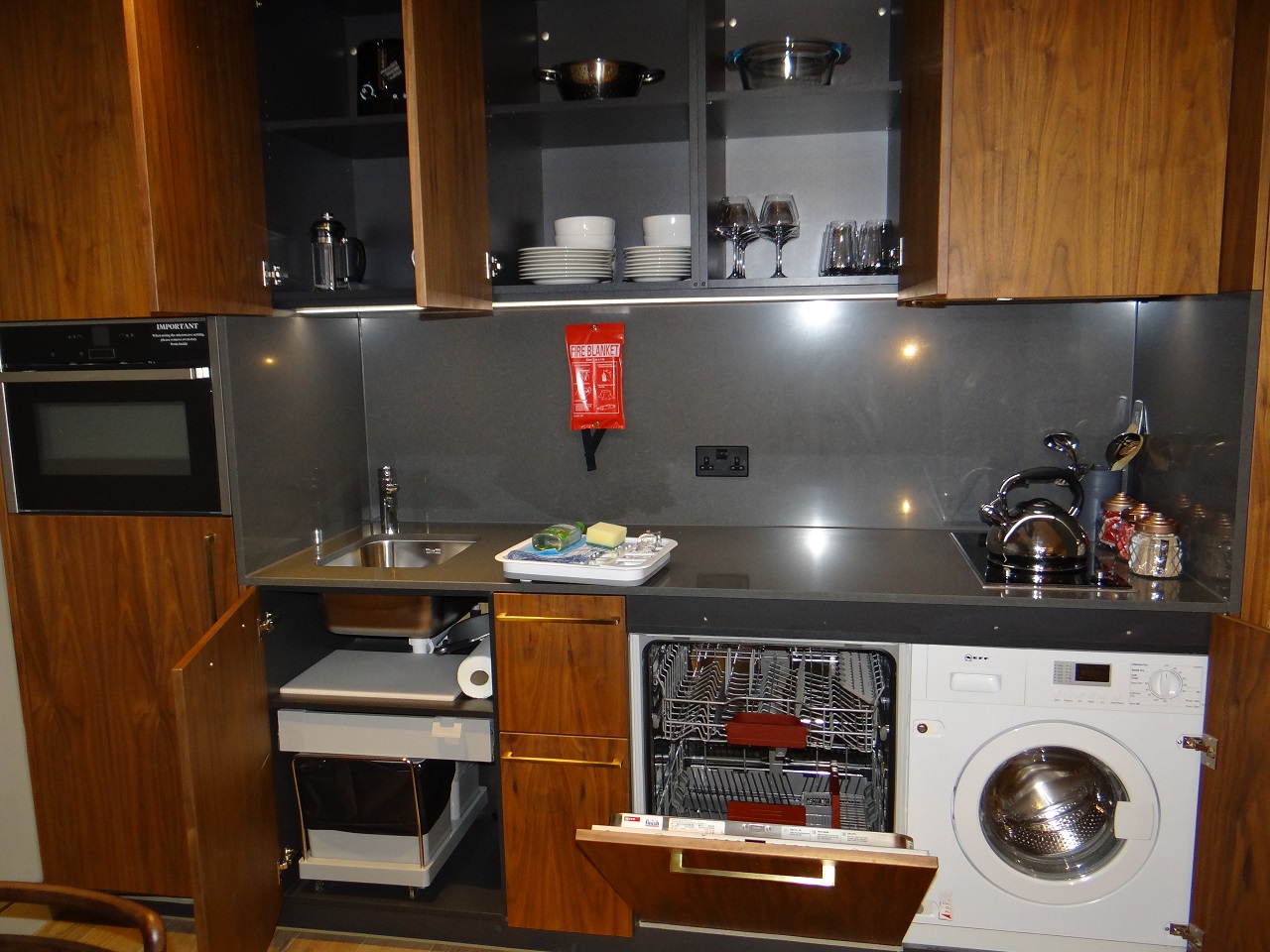 We chucked our bags aside and like curious children began to open all the cabinet doors in the kitchen to see what we had. We had dishes, glasses, and a coffee maker. We had a dishwasher and a washer/dryer combo. We had a small refrigerator and an oven. We had cleaning supplies and various rubbish bins to sort. This was a furnished kitchen that would definitely suffice for our two days but for those longer term guests, it was a nice perk in London. We met a few guests staying more than a month.