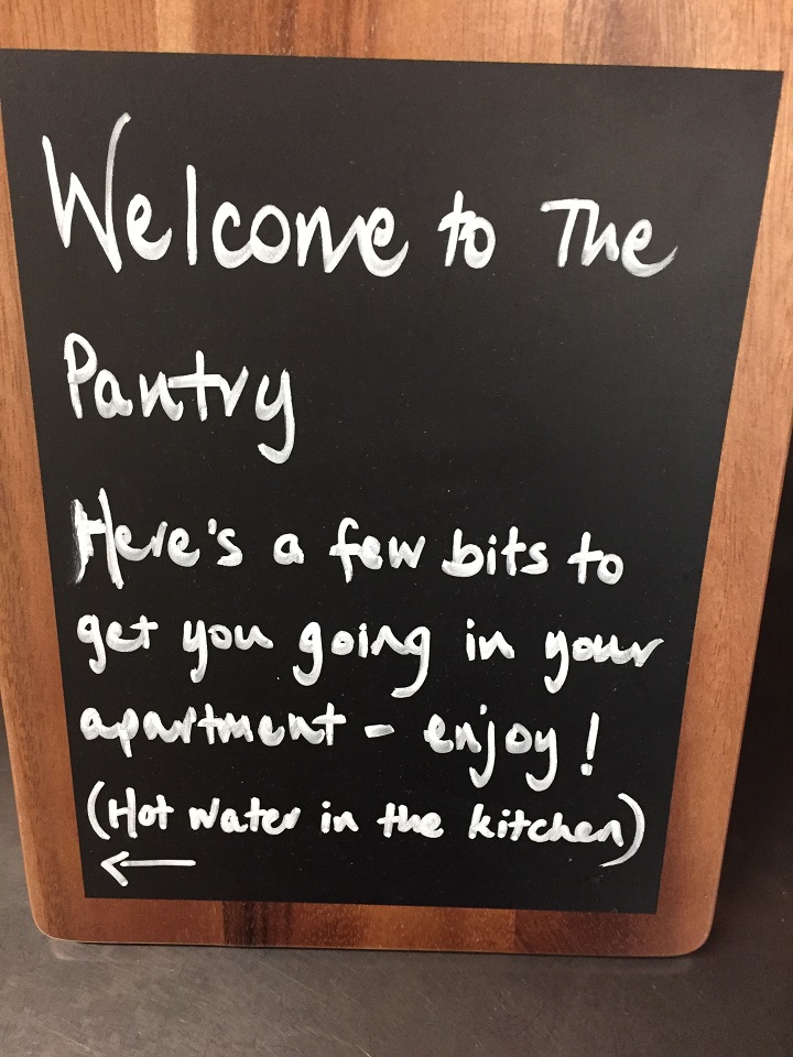 When the doors opened to the first floor we put our bags aside for a quick look in the pantry. It was filled with snacks, fruit and bottled water which were complimentary. It also contained condiments for foods (mustard, ketchup, olive oil, etc.) as well as cereals, snack bars and milk in the fridge. Of course, I was happy to see the bottled water – both room temperature and chilled.