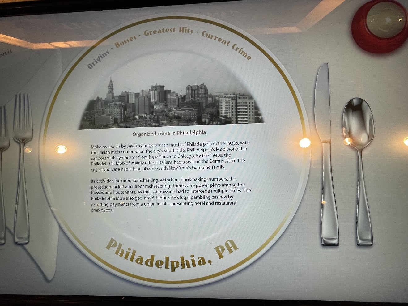 I started on the third floor where there is a mix of pictures, video, items under glass. The video plays the history while the surrounding panels illustrate the areas in which the mob operated -basically exploiting all industries – and how they recruited and what neighborhoods they recruited from in the key cities. As expected, Philadelphia was listed on the wall along with the neighborhoods I was quite familiar with.
