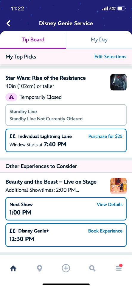 Tip – The Star Wars ride was also “out of service” by 11:30 so it was good to book this first thing in the morning. In my research, rides often go offline for a variety of reasons throughout the day in all the parks so keep this in mind.