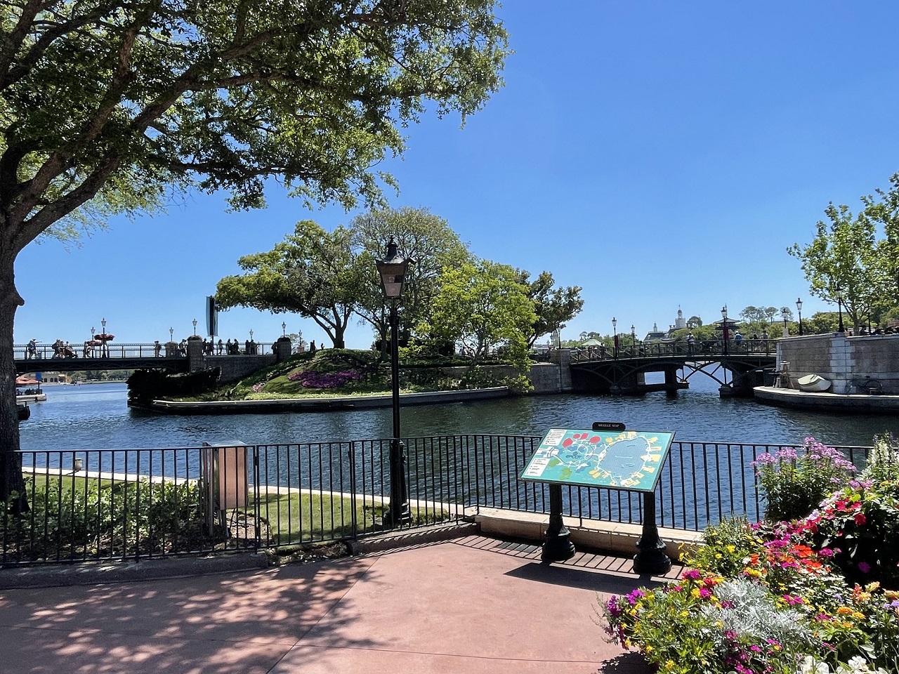 I easily tapped into the park and there was a restroom on the left (important if with little ones who also had treats on the ride) and the United Kingdom food kiosk for fish & chips ahead. I had completed only 7,600 steps this morning when I arrived at Epcot. You can use the Disney app to pre-order takeaway at many kiosks and restaurants in Epcot. United Kingdom fish & chips was one of the restaurants but I took my chances that there would be a short line when I arrived and I was right. With my fish & chips in hand, I found a seat along the water that was both quiet and picturesque save a few birds hoping for leftover scraps.
