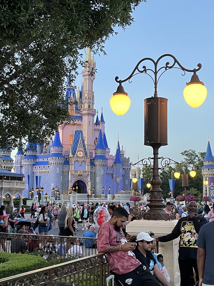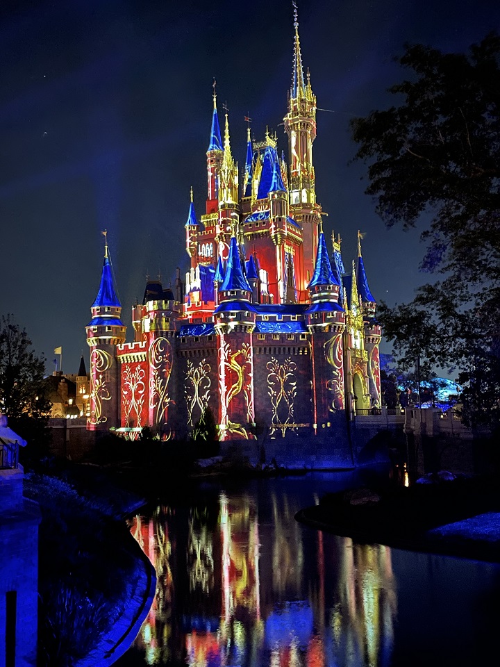The fireworks show in Magic Kingdom is now a mix of projected images on Cinderella’s Castle along with fireworks. My view of the castle was from the side and the fireworks overhead had a bit of an obstruction by the trees but overall was a good spot. My magic band changed colors during the show to match the color scheme, a bit of interactive fun for the kids, for adults it can be fun if you don’t think too much wearing a tracker all day.