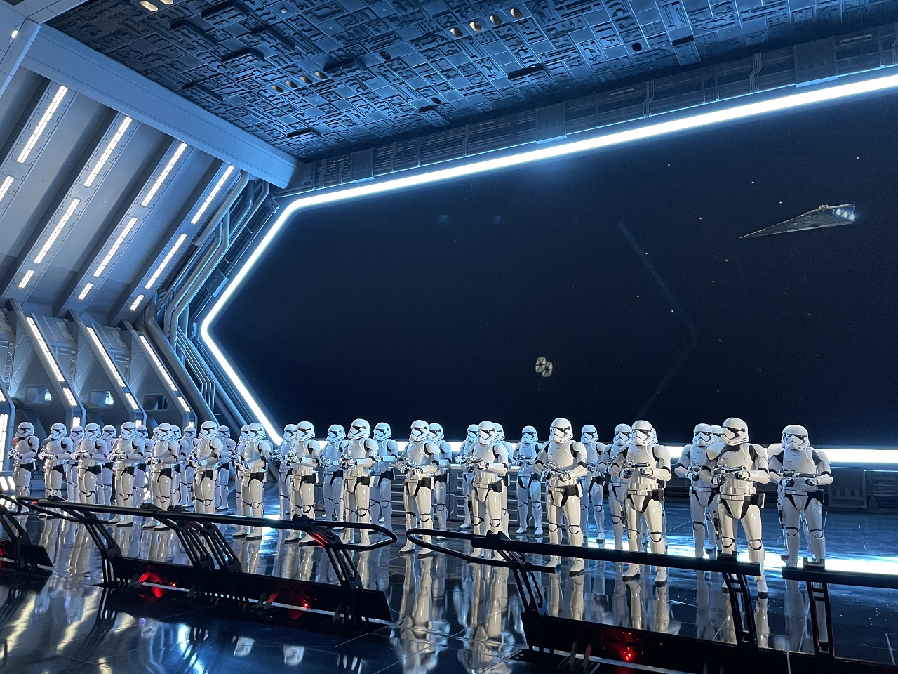 The ride was one that had many layers to it – a story, experience and a ride. We had the first room, then we went outside to our spaceship to ride up to the next level where the Stormtroopers “captured us” as the two lines for everyone (no priority here) merged to go to the next stage of the attraction. Prior to boarding the ride, they have you stand on a numbered spot and try to fill in all the numbers so when they called for a solo rider, I got to skip the line a little bit. We then moved to another room before boarding the ride as a group.
