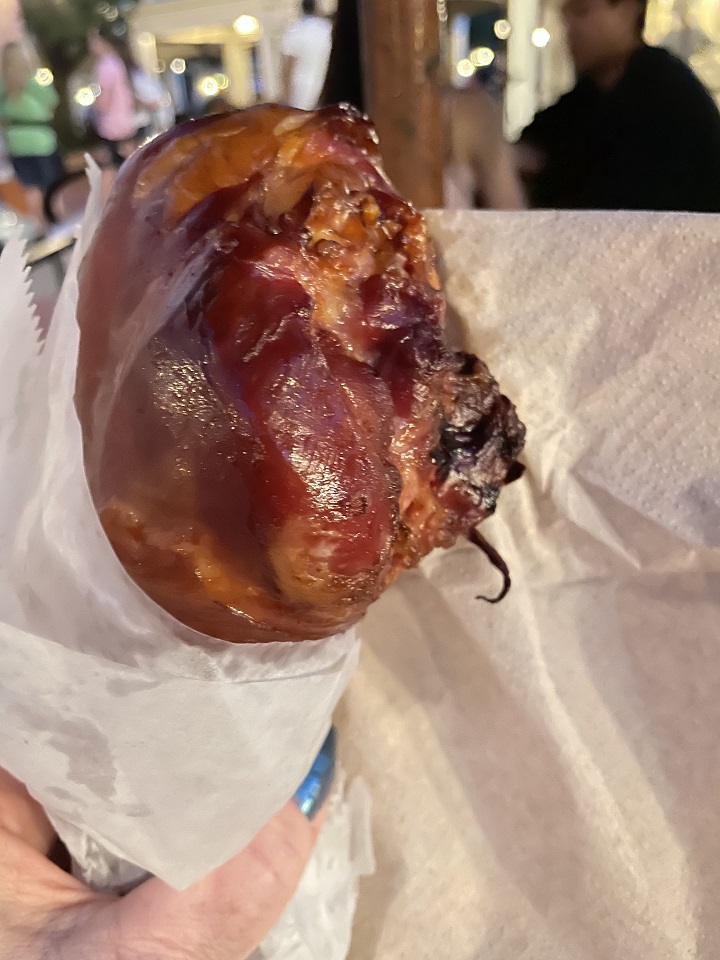 I arrived to the Magic Kingdom at 7:45 p.m. and was hungry. Main Street was packed with people lined up early for the best fireworks spots. I had a few failed attempts at food without a reservation so for the first time in my Magic Kingdom visits, I bought a turkey leg and a Mickey pretzel. It was dark now so when I bit into the infamous turkey leg, I was surprised it was pink inside. I’m not the best cook but I don’t think it should be pink so I went to ask a cast member who told me they brine it like ham so it will be pink and likely remind me more of ham but don’t worry its fine to eat. I ate a bit more but focused on the pretzel before finding a fantastic viewing spot on the bridge before it closed.