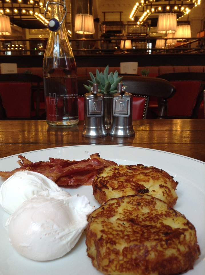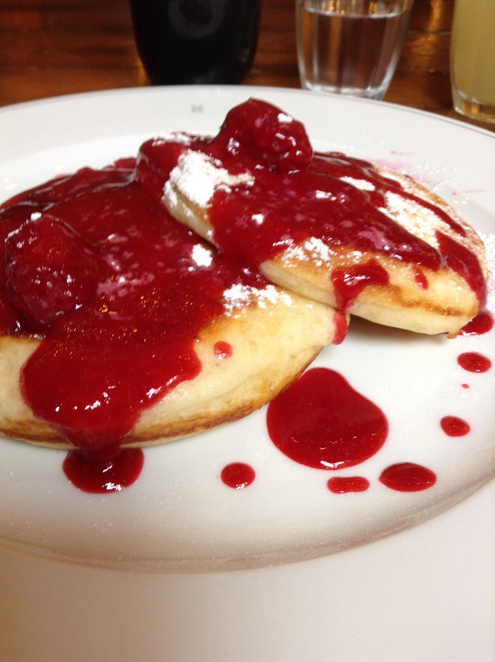 There is no breakfast buffet here it is ala carte and surprisingly reasonably priced (for a hotel). I would keep it simple with either eggs (£4.50) or pancakes (£7.50) and vary it by adding one or more sides – toast, potatoes, juice (£3.50) and maybe expense account bacon (£6.00). The pancakes took two tries to get it right as raspberry pancakes in the U.S. are not quite the same in the U.K. (the U.K. like it much, much sweeter as you can see below – more raspberry soup with a side of pancakes. Other hotels served it this way too). Service was quick, attentive and working in teams, constantly available.