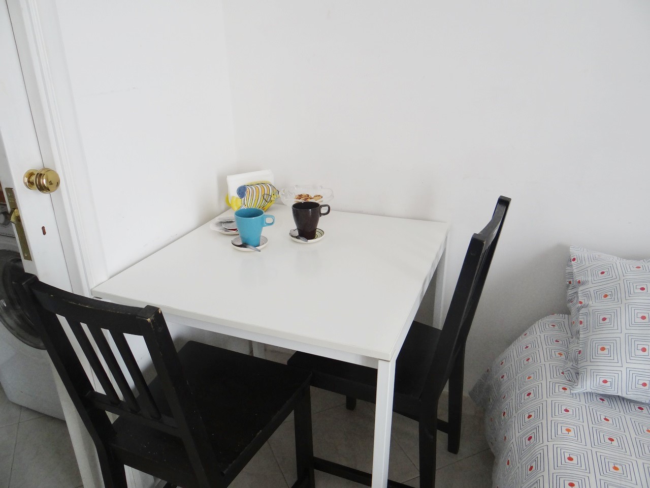 My room, which would be a studio apartment in many cities, was a surprise. With high ceilings, a tile floor and a double door window leading to the balcony, this was a large room. With two double beds on either side of the room, there was a bathroom, small kitchen, small table serving as a dining area, a large wardrobe and multiple tables. Absent were wall photos or splashes of color which I think would have tied it all together. After the tour of the room, I was given coupons for breakfast with a choice of four cafes in the area (generally a pastry and coffee – the sugar donuts are a MUST). It was comfortable to have so much space as well as a window with small balcony to get fresh air and look outside. The bed was a slat bed and I did dislodge one or two slats during the night that I put back in but otherwise it was comfortable.