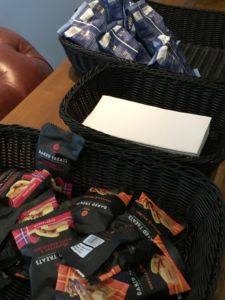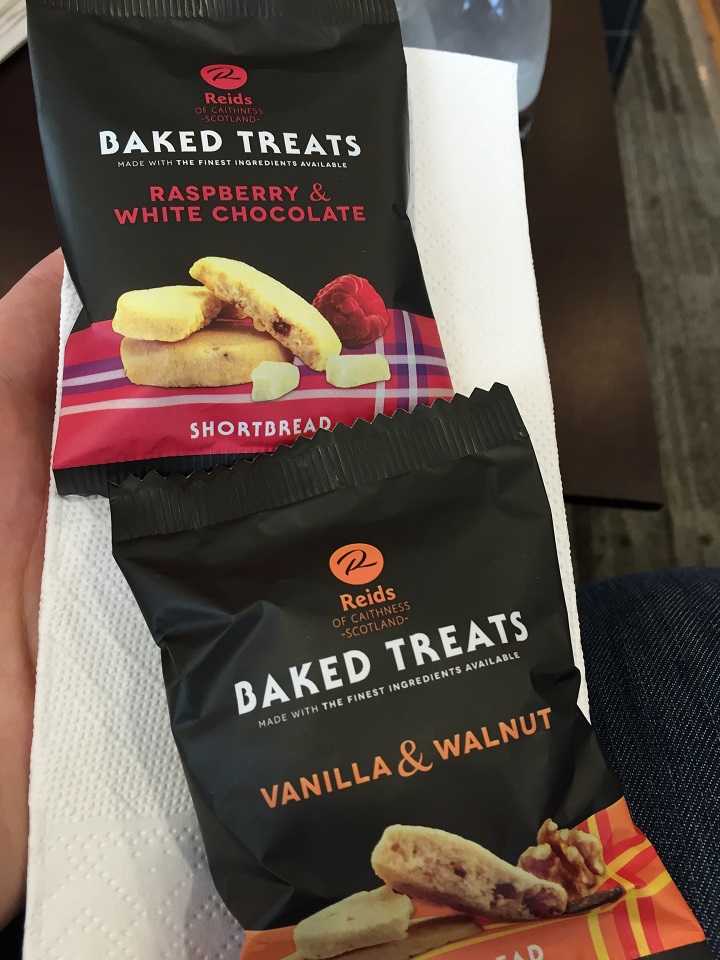 The “free refreshments” consisted of the café space on the counter with soft drinks and two hot drinks machines. The snack were located behind in two baskets – one with yummy Scottish butter biscuits (cookies, which would be served on the train as well), the other with crisps (potato chips). Despite the small selection, it was still a nice option to have included in the ticket.