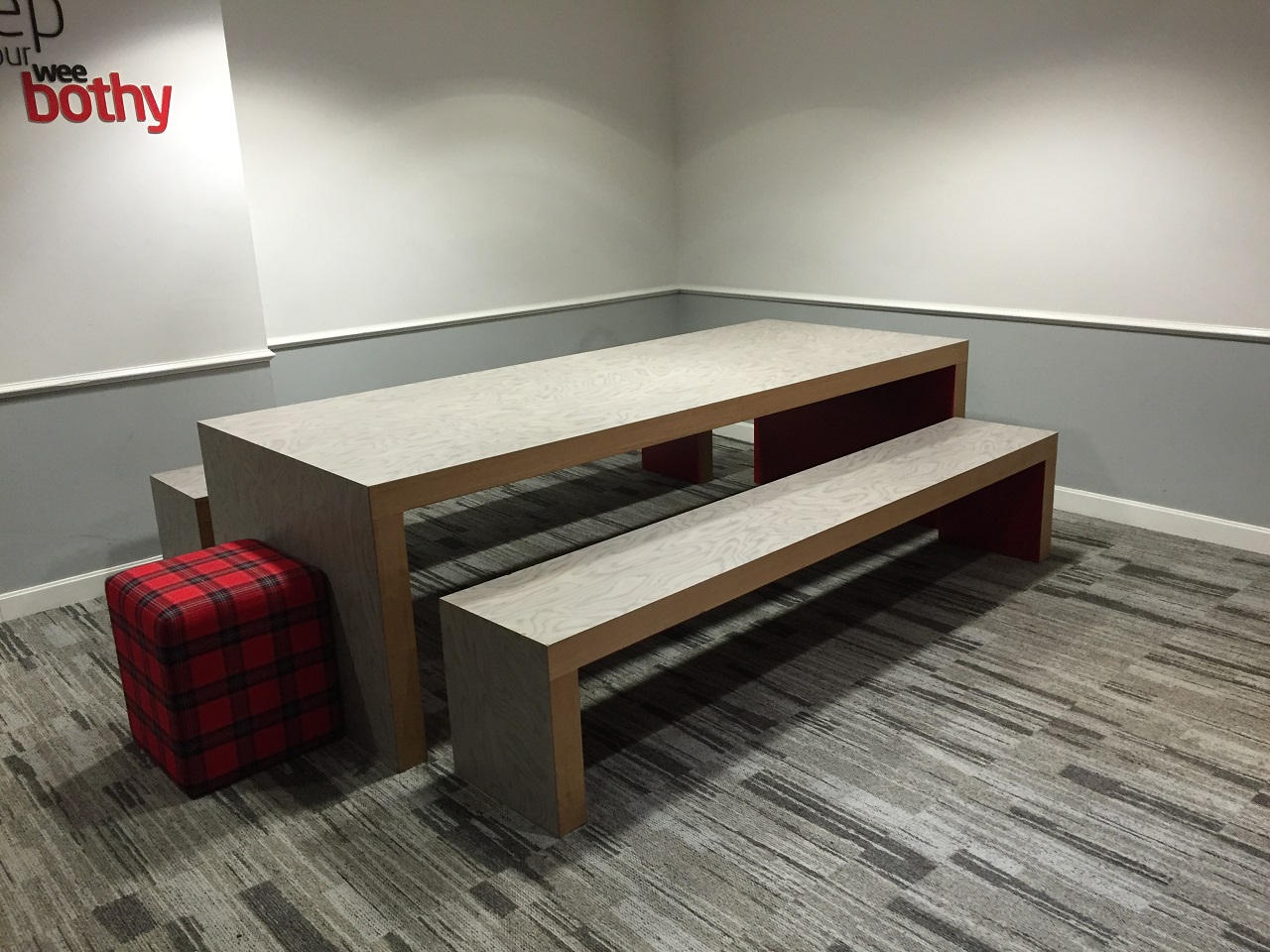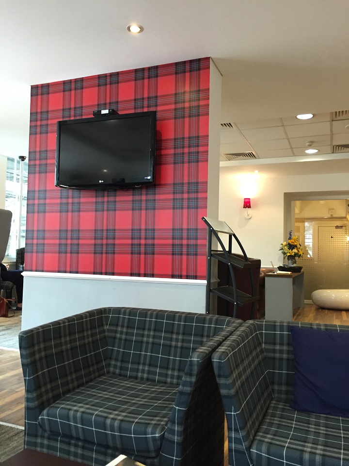 Then as stealth as I could be (not at all), I took photos of the space – the smartly designed chairs of all sizes and colors, some using soft leather, while others a plaid nod to Scotland. With a variety of seating options – small area for two, high top privacy sofas, open group working spaces and a child’s area the small lounge made excellent use of the space. There is a counter space to work with sufficient outlets. The lounge offers free wifi and a few television monitors to keep up with the news of the day.