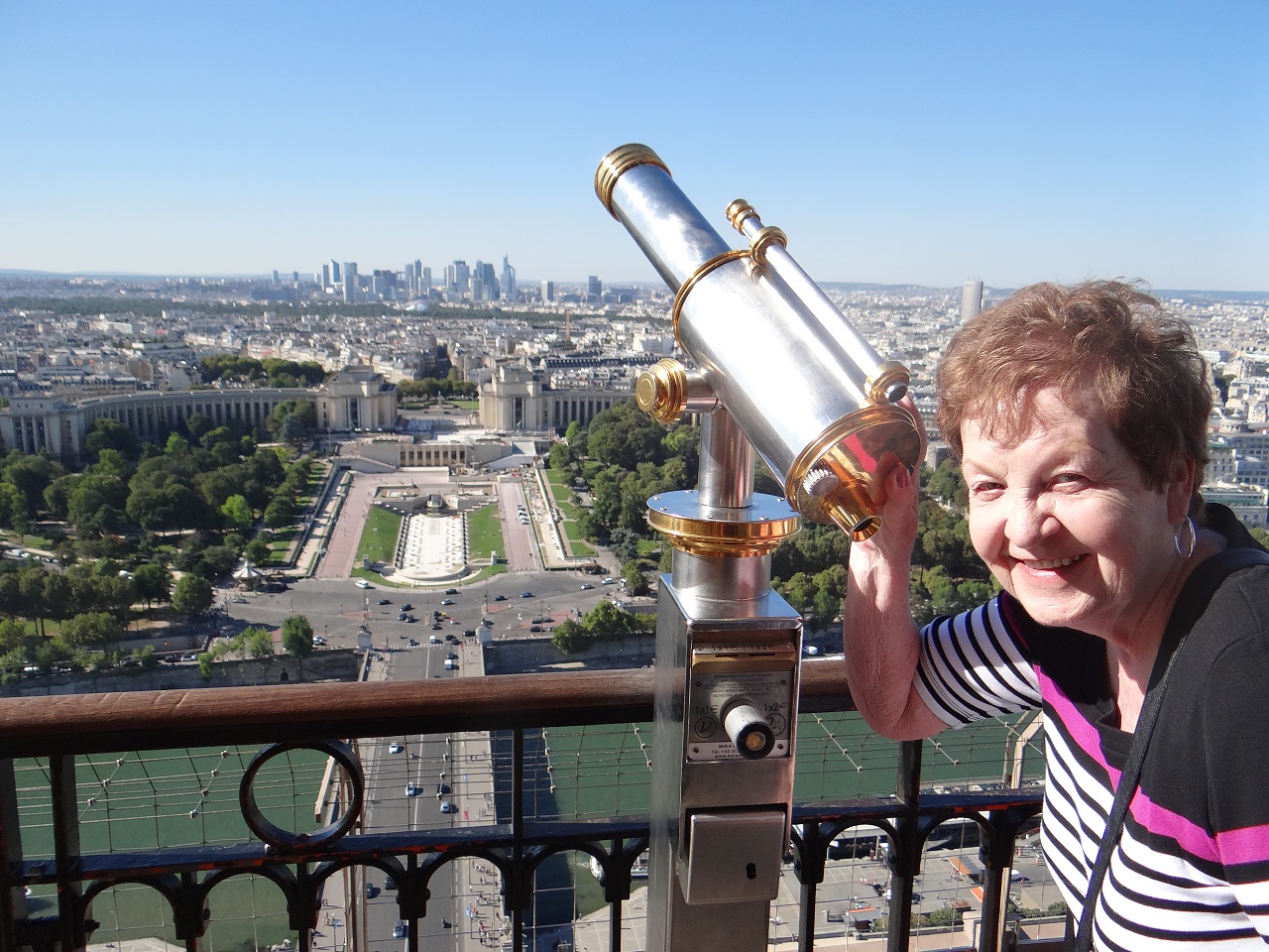 Most visitors start their Eiffel Tower visit on the 2nd floor. The observation area is over two floors and gives you a good sense of place and views of Paris. I pointed out Sacre Coeur, La Defense, Arc de Triomphe and other highlights to Mom. After fifteen minutes or so, Mom was ready to go! All that stress finding tickets, taking the Uber from the hotel, waiting on the group and going through security for fifteen minutes of a visit. Mom did get to enjoy a slushee from the café while we waited on the lift (this may have been a highlight for her at the time). The second floor has a food stand, macaron stand, souvenir shop and a restroom.